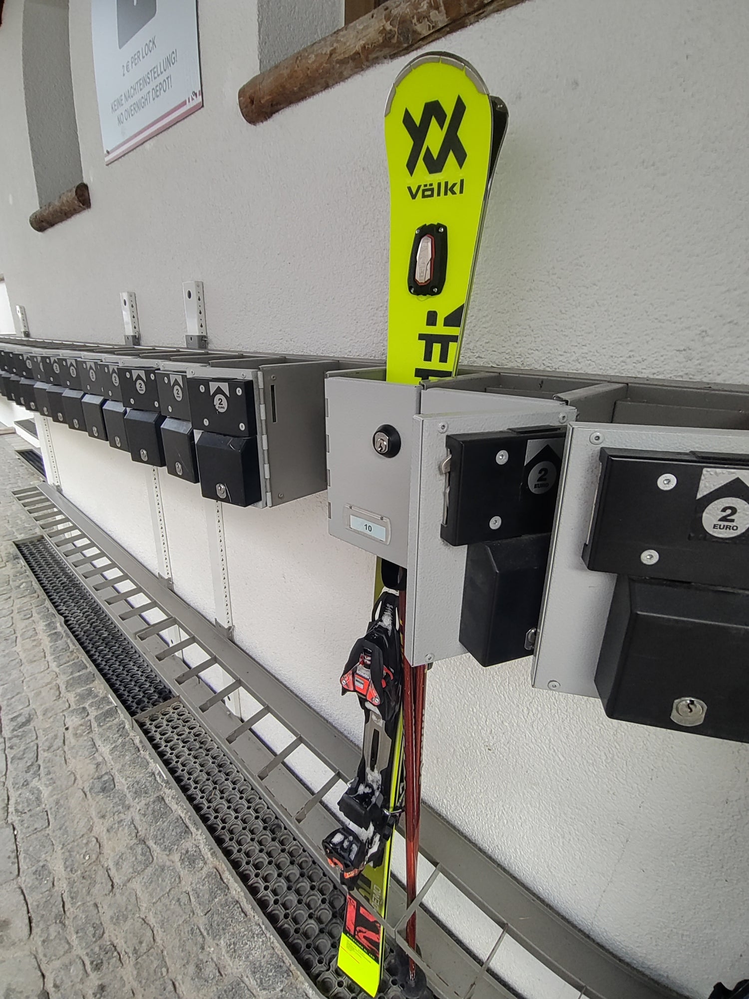 Dieses Bild zeigt, wie die Realität aussieht. Leere abschließbare Skiständer. Der Grund - 2€ pro Schließvorgang!